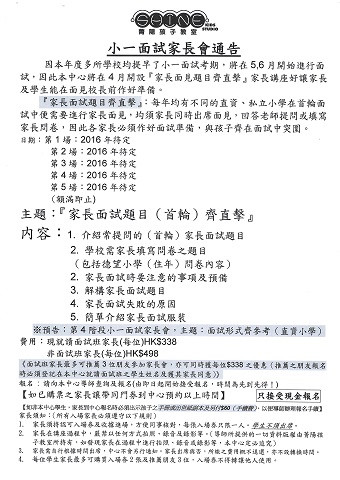 本中心面試班家長購買一套6張之家長會入場券,送$120學費現金券(需一次過付款)